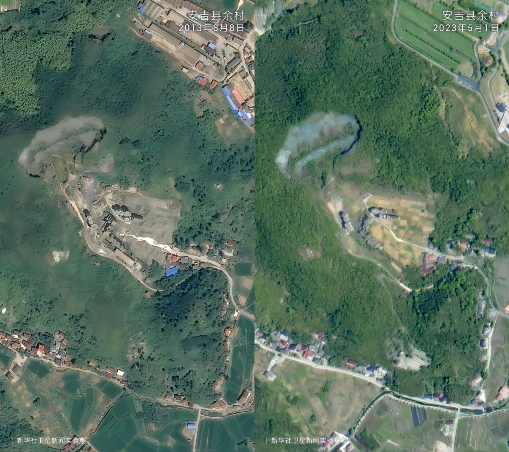 在“綠水青山就是金山銀山”理念指引下,20年來(lái)浙江省安吉縣余村完成了從水泥廠、礦山遍布到“人在余村走、就是畫中游”的精彩蝶變。衛(wèi)星云圖中的大片灰色如今已被滿目綠色所覆蓋,從“工業(yè)飛鳥(niǎo)”到“生態(tài)田園”,余村百姓看到了美景,富足了精神。