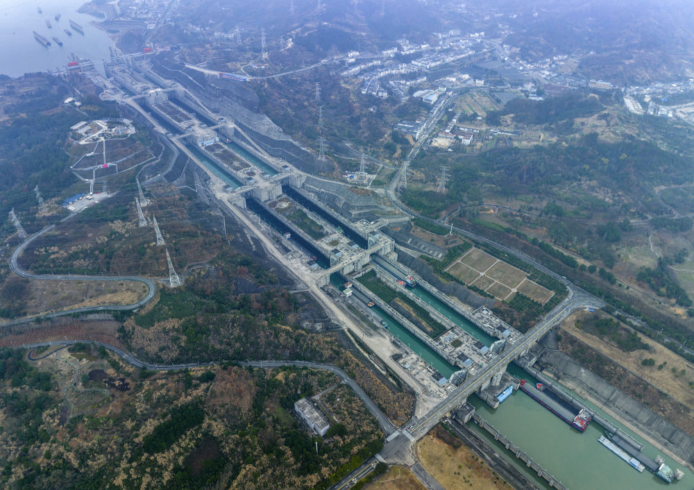 在湖北省宜昌市,船舶有序通過三峽樞紐五級船閘(2023年1月2日攝,無人機照片)。新華社發(fā)(王罡 攝)