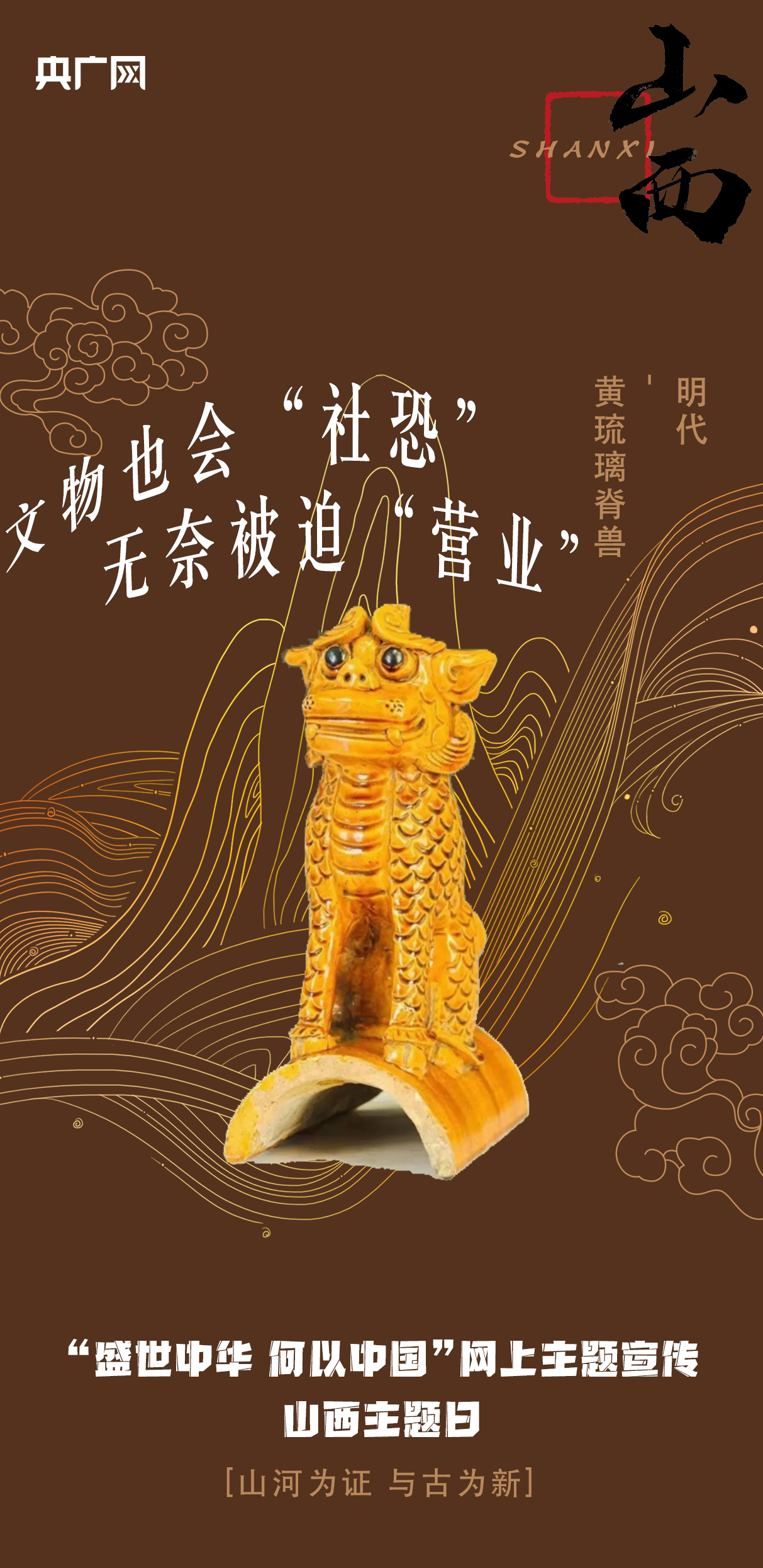 明代黃琉璃脊獸。由山西晉中介休文化館于1984年9月移交至介休博物館收藏保護(hù)。琉璃走獸高31.7厘米,通體金黃,色澤飽滿,形態(tài)逼真,流光溢彩。因眉頭緊皺,瞪圓雙眼的呆萌表情,被網(wǎng)友戲稱為“未成年文物”。
