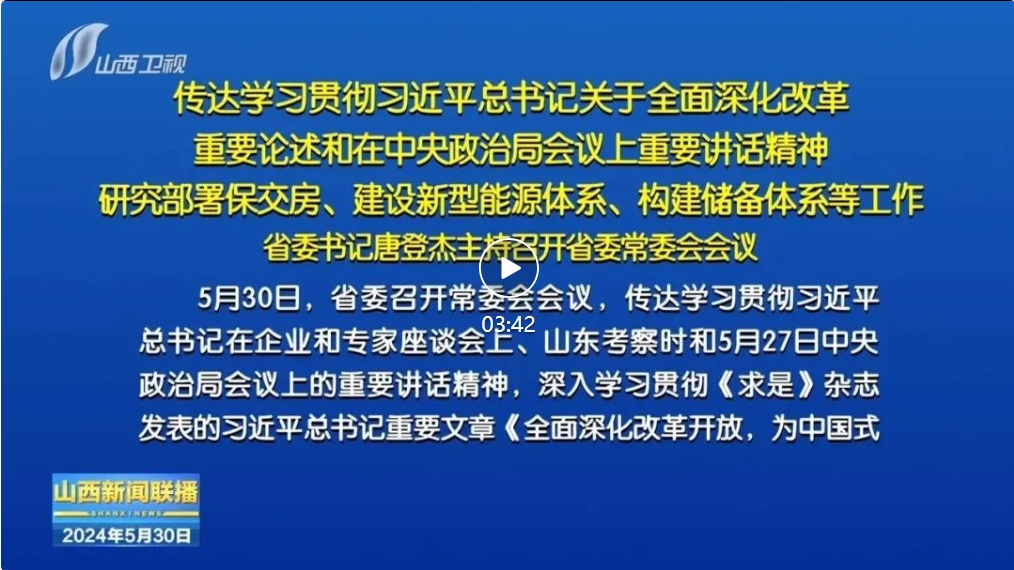 山西日?qǐng)?bào)報(bào)道 5月30日,省委召開(kāi)常委會(huì)會(huì)議,傳達(dá)學(xué)習(xí)貫徹習(xí)近平總書(shū)記在企業(yè)和專家座談會(huì)上、山東考察時(shí)和5月27日中央政治局會(huì)議上的重要講話精神,深入學(xué)習(xí)貫徹《求是》雜志發(fā)表的習(xí)近平總書(shū)記重要文章《全面深化改革開(kāi)放,為中國(guó)式現(xiàn)代化持續(xù)注入強(qiáng)勁動(dòng)力》,傳達(dá)貫徹全國(guó)切實(shí)做好保交房工作視頻會(huì)議精神,審議通過(guò)《山西省加快規(guī)劃建設(shè)新型能源體系的實(shí)施意見(jiàn)》《關(guān)于構(gòu)建山西省儲(chǔ)備體系的行動(dòng)方案》。省委書(shū)記唐登杰主持會(huì)議。