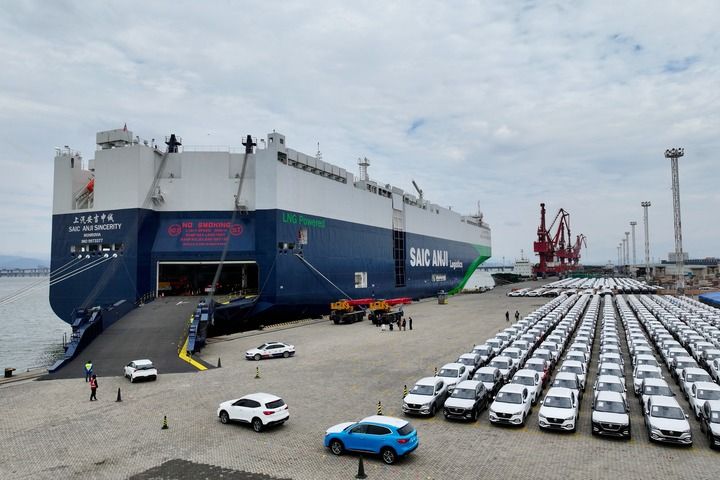2024年1月23日,在福建廈門東渡港區(qū)現(xiàn)代碼頭,出口車輛陸續(xù)駛上“上汽安吉申誠”號汽車滾裝船(無人機照片)。新華社記者 姜克紅 攝