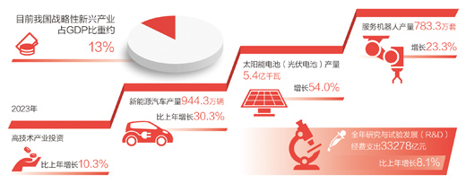“發(fā)展新質生產(chǎn)力,既有利于培育發(fā)展一批產(chǎn)業(yè)規(guī)模大、帶動能力強的支柱產(chǎn)業(yè),也有利于加快傳統(tǒng)產(chǎn)業(yè)轉型升級,增強我國經(jīng)濟發(fā)展韌性,推動經(jīng)濟實現(xiàn)質的有效提升和量的合理增長?!敝猩酱髮W黨委副書記、校長高松代表說。2023年,我國高技術制造業(yè)增加值增長2.7%,高技術產(chǎn)業(yè)投資比上年增長10.3%,新動能不斷積蓄。