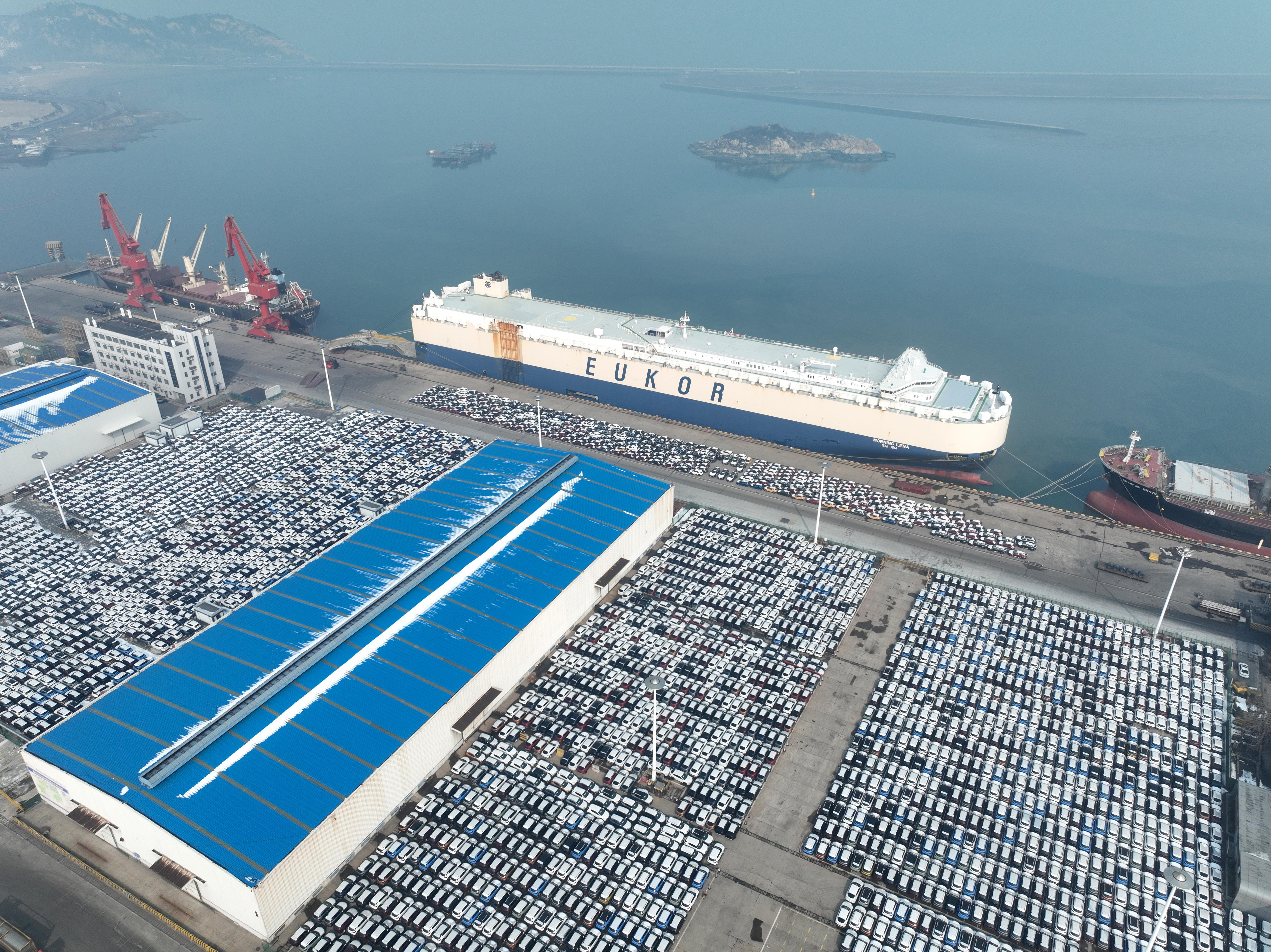 △在江蘇連云港港東方港務(wù)分公司碼頭,貨輪靠泊準備裝載汽車出口海外。