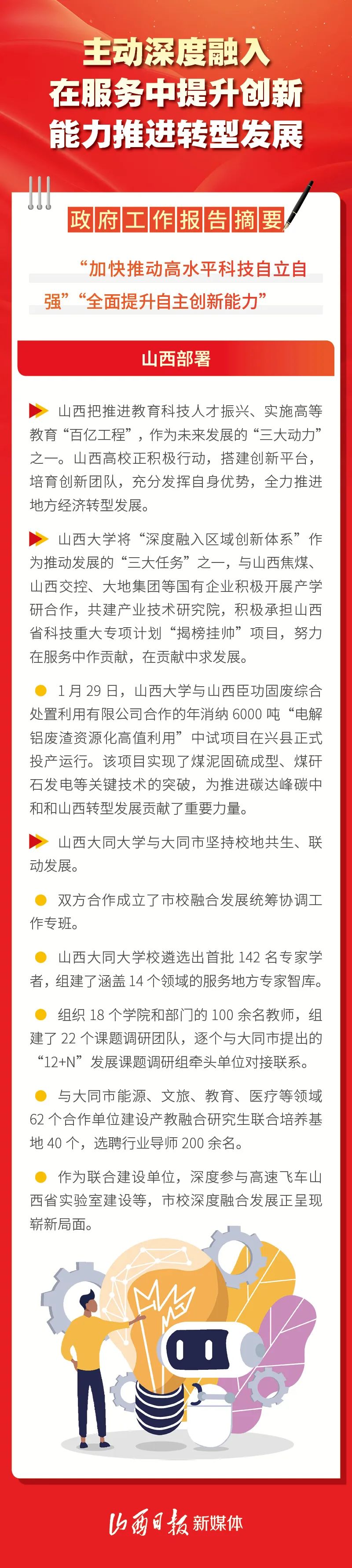今年政府工作報(bào)告指出,堅(jiān)持教育強(qiáng)國、科技強(qiáng)國、人才強(qiáng)國建設(shè)一體統(tǒng)籌推進(jìn),創(chuàng)新鏈產(chǎn)業(yè)鏈資金鏈人才鏈一體部署實(shí)施。這為山西高校更好地服務(wù)全省各地轉(zhuǎn)型發(fā)展、高質(zhì)量發(fā)展提供了遵循。