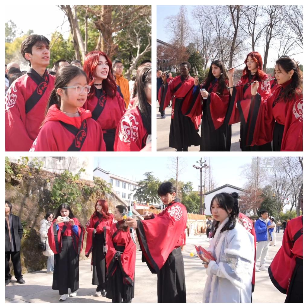 春節(jié)期間,來自浙江師范大學的10多位留學生在浙江金華參加了“我在中國過春節(jié)”的體驗項目。他們身著漢服,到金華府文廟,向孔子像行拜師禮,并在新年祈福牌上書寫新年愿景。