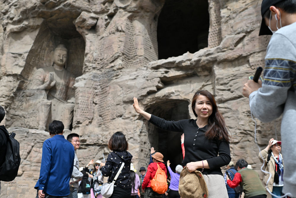 4月16日,在云岡石窟,游客擺出和大佛隔空“擊掌”的姿勢(shì)留影。