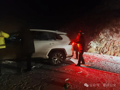 2024年11月25日晚18時,繁峙縣公安局指揮中心接到廣東游客趙岸華的報警求助電話,聲稱其一行四人駕車從河北來五臺山旅游,行至太行一號旅游公路神堂堡繁五交界路段時,因風(fēng)雪交加、道路結(jié)冰,車輛和人員被困。接到報警后,指揮中心立即通知神堂堡派出所和交警中隊前往救助。救援民警頂風(fēng)冒雪順著太行一號旅游公路沿路搜尋,經(jīng)過3個多小時的艱難跋涉,終于在神堂堡鄉(xiāng)盤道村往南約5華里的路上(已屬五臺山風(fēng)景區(qū)地界)找到了被困車輛。當(dāng)時該車燃油即將耗盡,車上四人凍得瑟瑟發(fā)抖,救援民警當(dāng)即將3名乘客轉(zhuǎn)移至警車上,并協(xié)助拖車司機(jī)將被困車輛連上拖車后原路折返,最終在11月26日凌晨2時將被困游客和車輛安全營救回派出所。