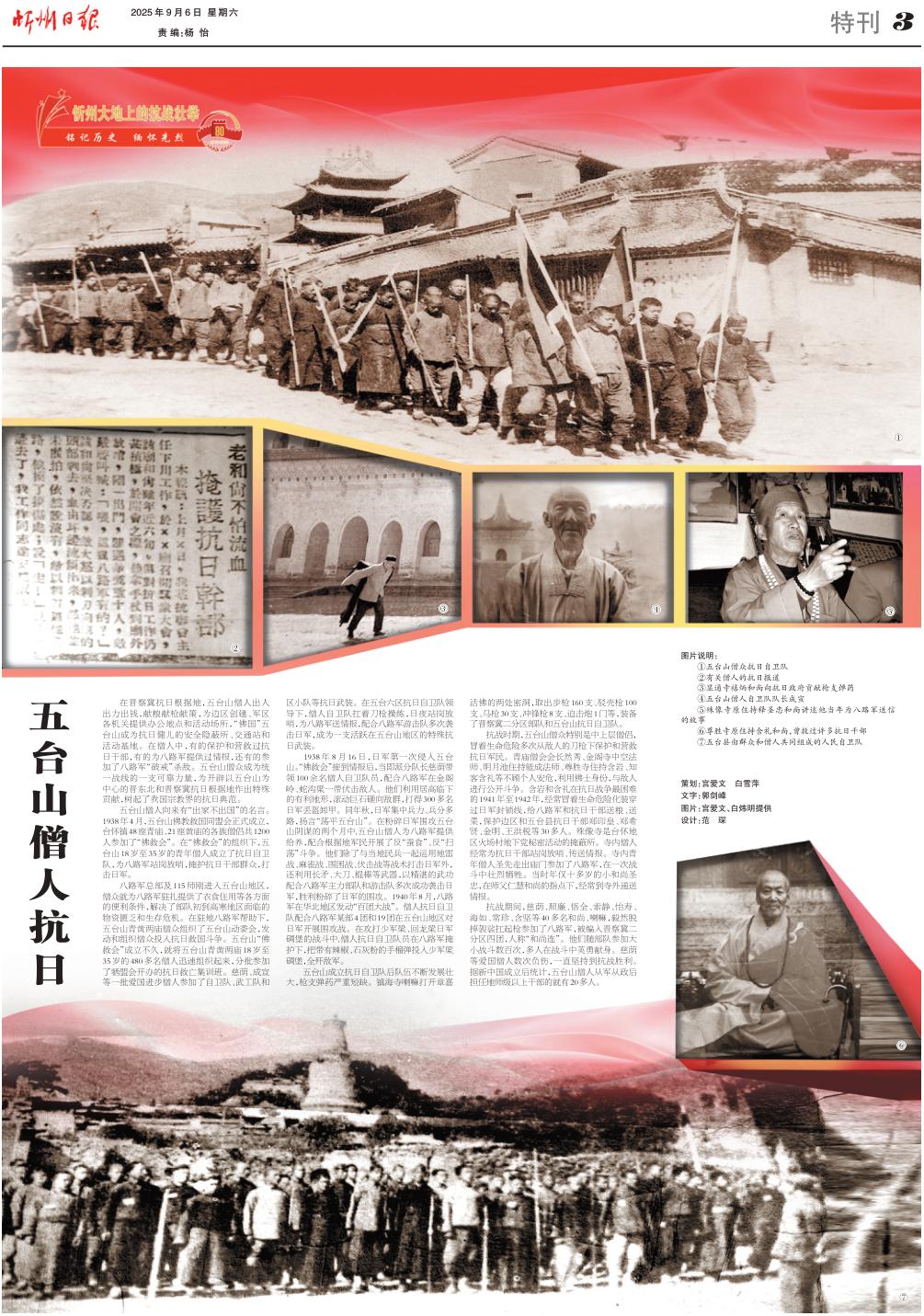 1938年8月16日,日軍第一次侵入五臺山?!胺鹁葧苯拥角閳蠛螅?dāng)即派分隊長慈蔭帶領(lǐng)100余名僧人自衛(wèi)隊員,配合八路軍在金閣嶺、蛇溝梁一帶伏擊敵人。他們利用居高臨下的有利地形,滾動巨石砸向敵群,打得300多名日軍丟盔卸甲。同年秋,日軍集中兵力、兵分多路,揚(yáng)言“蕩平五臺山”。在粉碎日軍圍攻五臺山陰謀的兩個月中,五臺山僧人為八路軍提供給養(yǎng),配合根據(jù)地軍民開展了反“蠶食”、反“掃蕩”斗爭。他們除了與當(dāng)?shù)孛癖黄疬\(yùn)用地雷戰(zhàn)、麻雀戰(zhàn)、圍困戰(zhàn)、伏擊戰(zhàn)等戰(zhàn)術(shù)打擊日軍外,還利用長矛、大刀、棍棒等武器,以精湛的武功配合八路軍主力部隊和游擊隊多次成功襲擊日軍,勝利粉碎了日軍的圍攻。1940年8月,八路軍在華北地區(qū)發(fā)動“百團(tuán)大戰(zhàn)”。僧人抗日自衛(wèi)隊配合八路軍某部4團(tuán)和19團(tuán)在五臺山地區(qū)對日軍開展圍攻戰(zhàn)。在攻打少軍梁、回龍梁日軍碉堡的戰(zhàn)斗中,僧人抗日自衛(wèi)隊員在八路軍掩護(hù)下,把帶有辣椒、石灰粉的手榴彈投入少軍梁碉堡,全殲敵軍。