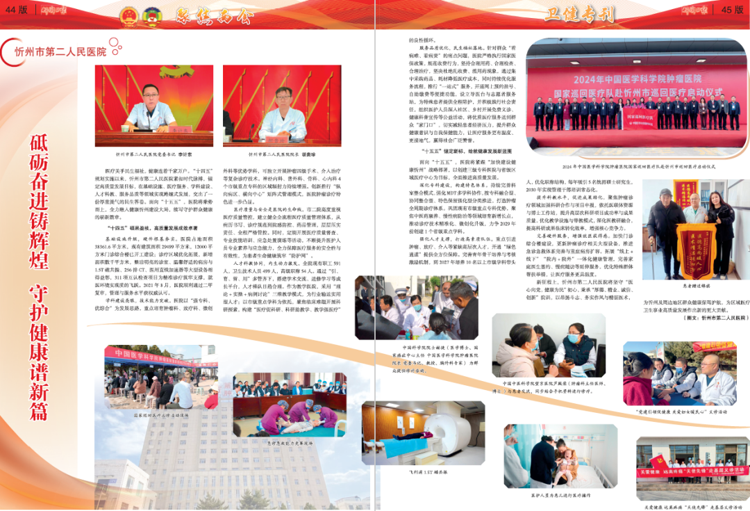 醫(yī)療關(guān)乎民生福祉,健康連著千家萬戶?!笆奈濉币?guī)劃實(shí)施以來,忻州市第二人民醫(yī)院緊扣時代脈搏,錨定高質(zhì)量發(fā)展目標(biāo),在基礎(chǔ)設(shè)施、醫(yī)療服務(wù)、學(xué)科建設(shè)、人才科教、服務(wù)品質(zhì)等領(lǐng)域?qū)崿F(xiàn)跨越式發(fā)展,交出了一份厚重提氣的民生答卷。面向“十五五”,醫(yī)院將乘勢而上,全力融入健康忻州建設(shè)大局,續(xù)寫守護(hù)群眾健康的嶄新篇章。